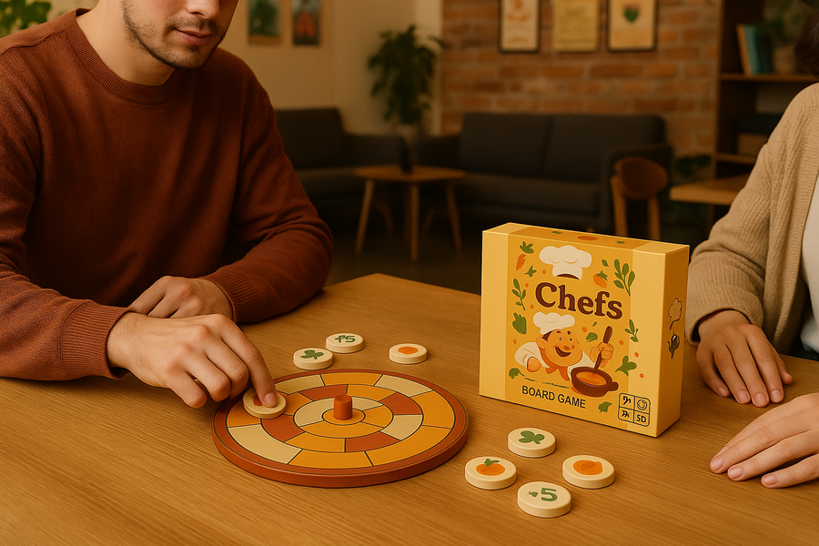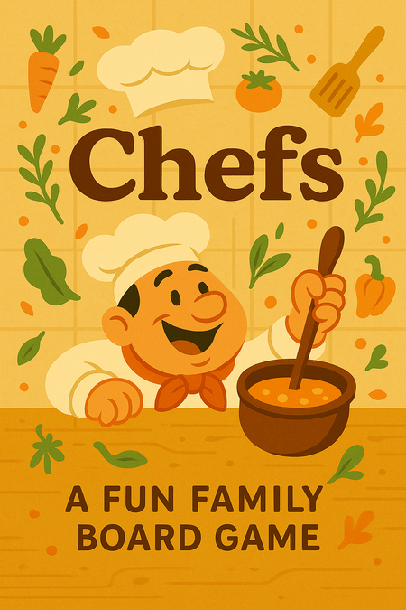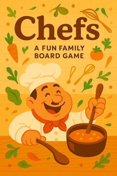 Промт: Create a cozy, eye-catching poster for the family board game «Chefs.» Keep the style consistent with the game box: warm colors, soft shapes, and playful vector elements like vegetables, herbs, and utensils. Show one cheerful chef holding a spoon or pot, with the «Chefs» title in bold and the tagline «A Fun Family Board Game.» Add subtle cooking-inspired textures (kitchen tiles, wooden table) while keeping the layout clean and minimal. The mood should express joy, teamwork, and creativity.