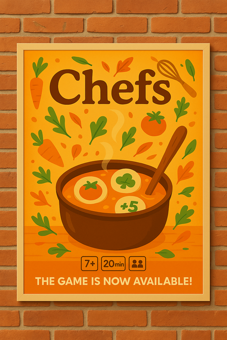 Промт 1: Create a bright A1 outdoor poster for the board game «Chefs.» In the center, place a pot of soup with floating game tokens, stirred by a wooden ladle. Add flying vegetables and utensils for a lively, dynamic look. At the bottom, include icons (7+, 20 min, 2–4 players) and the caption «The game is now available!» The background should be a cozy brick wall in warm tones. Everything must be clear and eye-catching.
