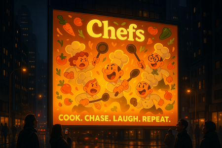 Промт (вечерний рекламный баннер): Create a large nighttime digital billboard scene in a busy city center, showing a glowing animated-style poster for the board game «Chefs.» The billboard should be brightly illuminated with warm neon tones standing out beautifully against the dark evening background. On the poster itself, several cheerful cartoon chefs are running after each other, playfully trying to hit one another. Around them, colorful vegetables and ingredients. Add glowing reflections of the billboard light on nearby wet pavement, cars, and windows, and show a few pedestrians taking photos. The «Chefs» logo should glow softly at the top, with a tagline «Cook. Chase. Laugh. Repeat.».