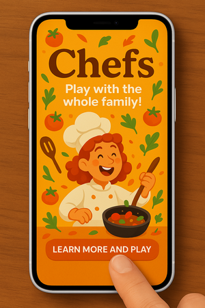 Промт (на модели iPhone): Create a bright vertical mobile banner promoting the board game «Chefs.» It should instantly evoke joy and make users want to click the «Learn More and Play» button. Place a smiling red-haired girl chef in the center, tossing vegetables or cooking, with a large «Chefs» title and the tagline «Play with the whole family!» At the bottom, add a big «Learn More and Play» button. The ad should appear inside a white iPhone frame, lying on a wooden table background, with a realistic human finger about to tap the button.