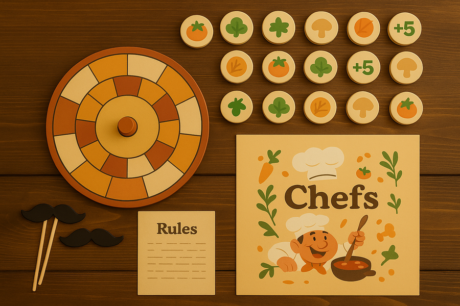 Промт 2 (игровые компоненты вне коробки): Create a realistic tabletop composition showing all the components of the «Chefs» board game neatly arranged on a wooden table, without the box. Use colorful tokens, a neatly folded game board, and a rule sheet with small printed text, dotted lines. Also include small sticks with paper mustaches. Use soft, warm lighting and keep the overall composition cozy and appealing and the same art style and materials as in the box design.