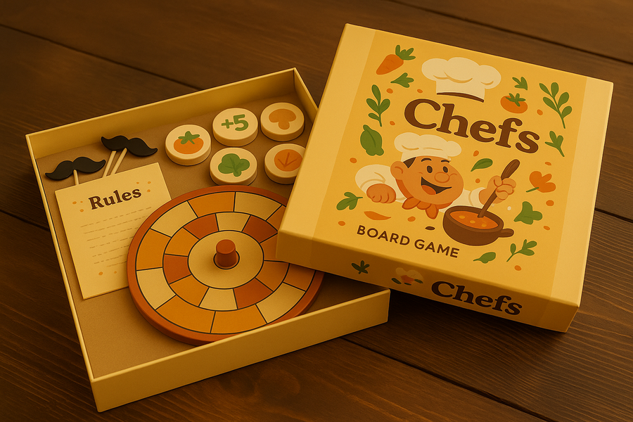 Прикрепить карточку Промт 1 (игровые компоненты в коробке): Create a realistic open box for the board game «Chefs», matching the style and color palette of the attached image. The box lid should be slightly lifted or placed nearby, revealing what’s inside. Inside the box, show game components: colorful tokens, a neatly folded game board, and a rule sheet with small printed text, dotted lines. Also include small sticks with paper mustaches. Use soft, warm lighting and keep the overall composition cozy and appealing, with a clear focus on the open box and its contents.