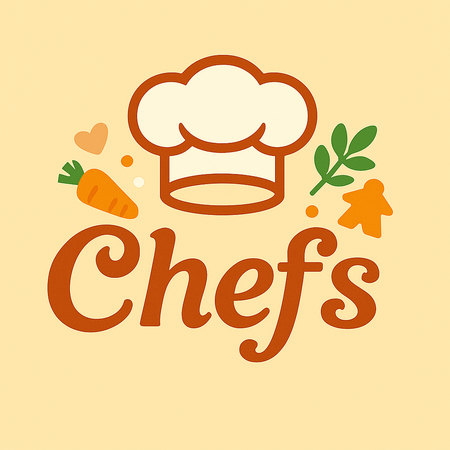 Промт: Use this warm and cozy color palette to create two minimalist logo variations for a board game about chefs called «Chefs». Keep the same composition with the chef’s hat, carrot, and leaves, but explore different friendly font styles: one bold and playful, and the other softer and elegant. The logo should feel cheerful, matching the tone of the game’s visual identity.