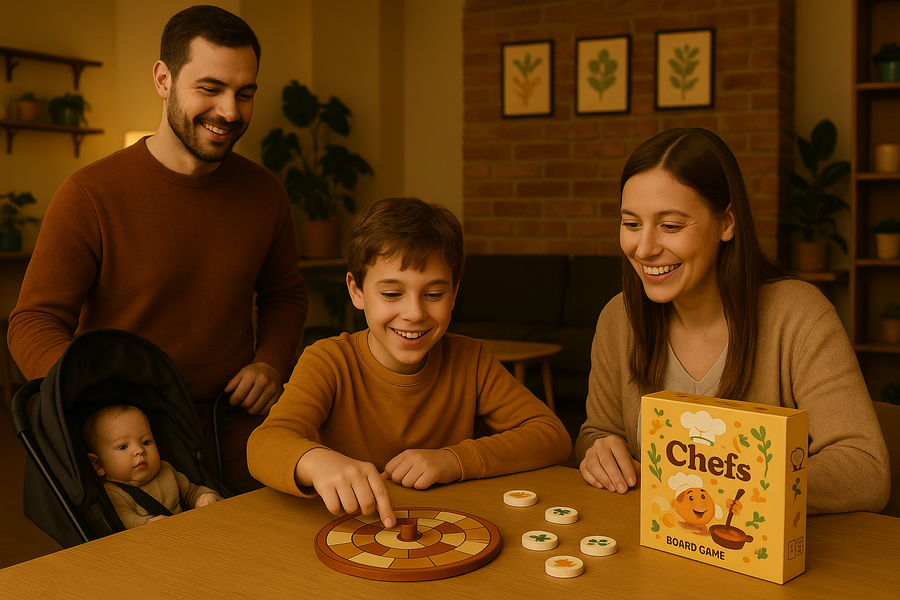 Промт 2: Create a realistic anti-cafe in the style of the project (warm lighting, wooden tables, soft chairs, and calm background decor, similar to the reference image). At the main table, show a mother and her 10-year-old child sitting together, smiling and playing the «Chefs» board game (with the same box, board, and small tokens as in the reference). The father stands nearby with a happy, caring expression, next to a baby stroller, watching them play.