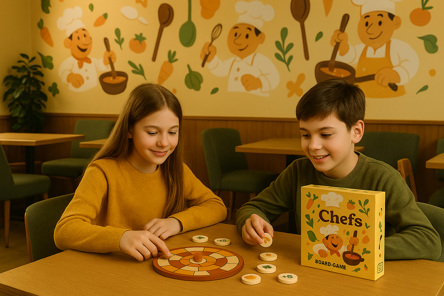Промт 4: Create a realistic anti-cafe in the style of the «Chefs» board game. The room should look like a real, cozy café with illustrations of chefs, vegetables, and kitchen utensils. At the center table, show two real children (a boy and a girl, around 12 years old) playing the «Chefs» board game (using the same box, board, and small tokens from the reference image).