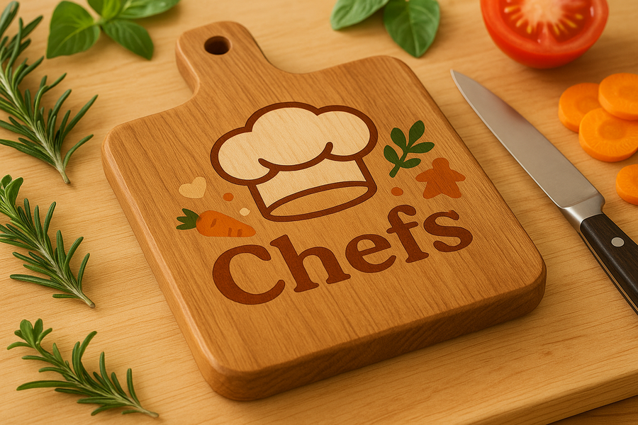 Промт (разделочная доска): Create a realistic wooden cutting board with the «Chefs» logo (as in the attached image) in the center. The logo should keep its original colors and style. The scene should be softly with natural light, showing wood texture. Add a few kitchen elements nearby, as if the board is part of a cooking scene.