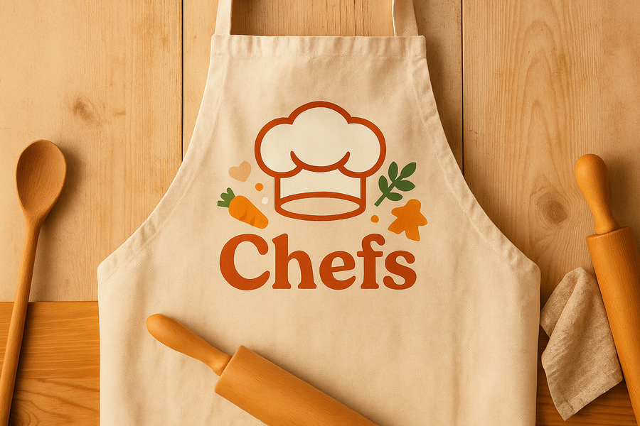 Промт (фартук): Create a realistic chef apron with the «Chefs» logo printed on the front. The apron should be soft cotton, in warm beige or light cream, matching the game’s color palette. Place the logo centered, keeping its original proportions and colors. Show the apron laid flat on a wooden table with small kitchen props nearby — a wooden spoon, rolling pin, or towel. Keep the look clean, cozy, and realistic with warm lighting textures.