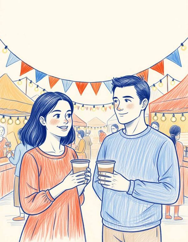 Промт в ChatGPT: Создай промт для постера-афиши ярмарки напитков народов России «AMBROSIA». Улыбающаяся девушка держит в руках бумажный стакан, на неё падает мягкий свет от гирлянды. Рядом с ней мужчина, который тоже держит стакан в руке. Промт: Постер ярмарки напитков народов России «AMBROSIA». Улыбающаяся девушка и мужчина держат бумажные стаканы, на них падает мягкий тёплый свет гирлянды. Атмосфера уюта и дружбы, вечерняя ярмарка с флажками на фоне. Карандашный стиль, тёплая палитра — синий, оранжево-красный, бежевый. Сохрани стиль простым, не используй градиенты и прочие эффекты.