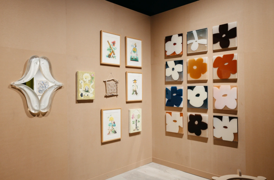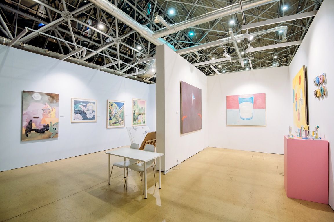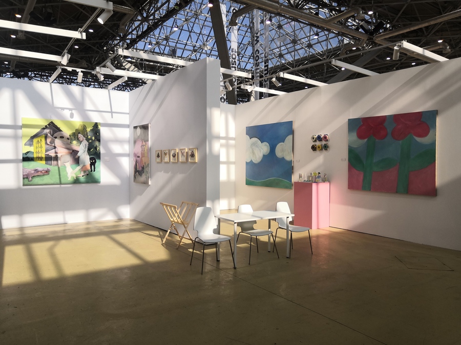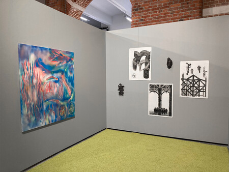 Стенд MYTH Gallery. Blazar. 2021. Живописные работы Анны Афониной из серии «game» и «я тебя где-то видел» (2021). Графика и керамические объекты Soldat der Schönheit (Сергея Савельева). Музей Москвы