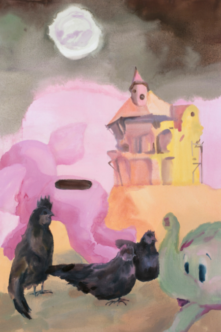 Первой «победой неоинфантилизма» кажется стенд галереи Sistemа на Cosmoscow в 2023 году. Пространство поделено на две части: на одной представлена новая серия живописи и графики Алины Кугуш из проекта «Атлас Чрезвычайных Ситуаций (АЧС)». Это нежные мистические миры, наполненные картографическими фантазиями и мутациями воспоминаний. Интересно, как художница превращает в иллюзию и сами медиа. Материалы притворяются друг другом, где масляная живопись подражает акварельной технике, привычная камерность которой нарушена размером живописного холста.