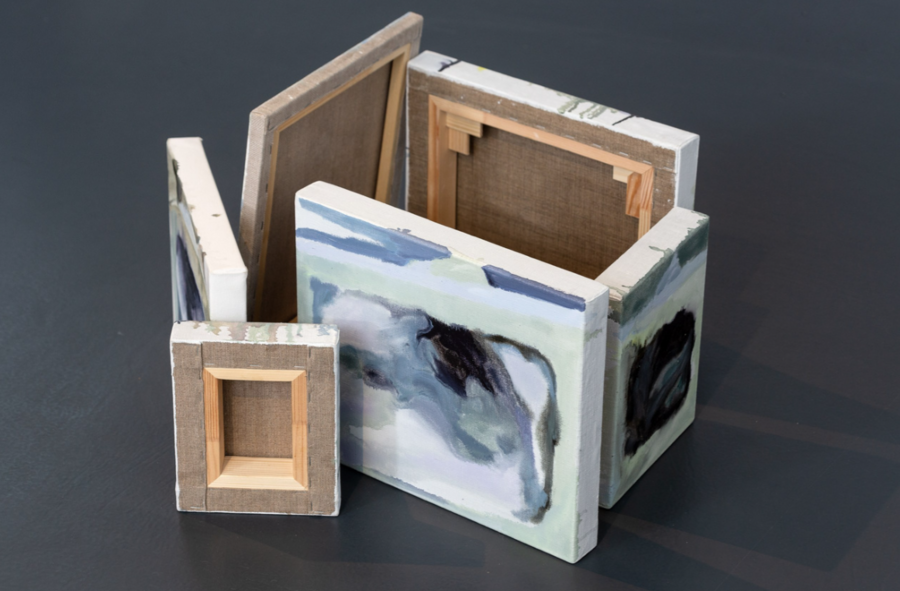 Алина Кугущ. Изнанка монумента, 2025. Инсталляция из 7 холстов. От 20×16 см до 30×35 см Выставка «Бунт вещей» в Пространстве А. 6 февраля — 1 марта 2025