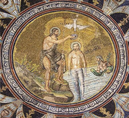 Мозаика «Крещение Господне»/ около 500-526 годов н. э.«Благовещение со святыми Маргаритой и Ансаном»/ 1333 год/ Симона Мартини и Липпо Мемми