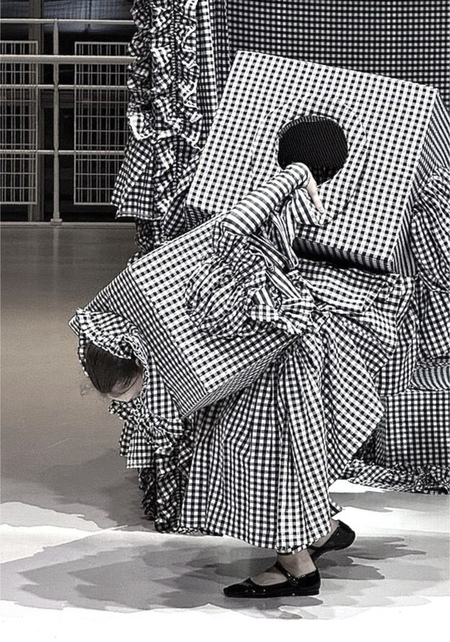 Для действия Роман создает костюм-матрешку из пяти кубов в черно-белой ткани в клетку виши.