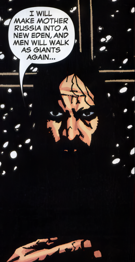Нарративно Распутин в «Hellboy» построен как фигура, действующая вне любых исторических рамок. Миньола намеренно лишает его понятного происхождения и читаемой мотивации, персонаж появляется в разных эпохах и каждый раз сохраняет автономию и собственную внутреннюю логику, которую невозможно предугадать ни пособникам, ни врагам. Все союзы, в которые он вступает, от оккультных орденов до сверхъестественных сущностей, оказываются временными инструментами, а не реальным сотрудничеством. Его цели никогда не артикулированы полностью и не совпадают с интересами тех, кто считает себя его соратником. Такая закрытость и стратегическая непрозрачность превращают Распутина не в идеологического противника, а в носителя собственной изолированной траектории, продолжающейся сквозь десятилетия и не зависящей от политических декораций.