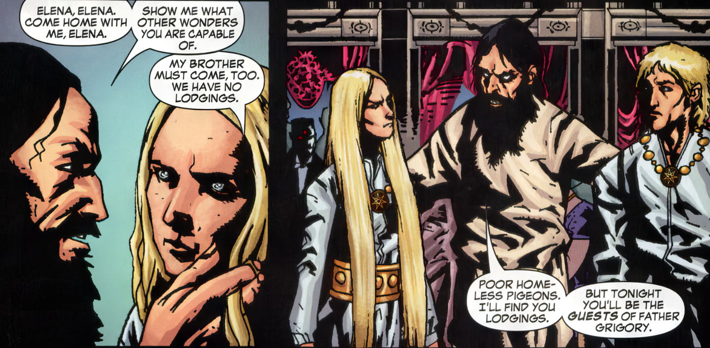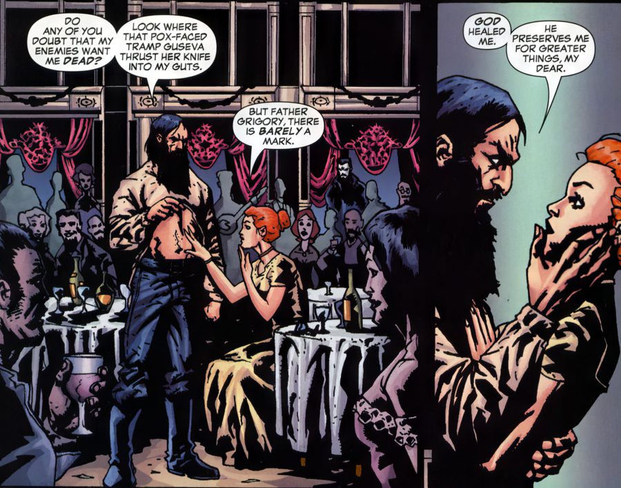 Серия сознательно строится как дистанцирование от привычной демонизации. Авторы оставляют ключевые элементы легенды, крестьянское происхождение, странствия, целительство, придворную роль, убийство заговорщиками, но каждый раз смещают акцент: не на разрушении, а на попытке сохранить хоть какую-то жизнь внутри катастрофического века. Распутин у Гресиан и Россмо не манипулятор, не архитектор политического заговора, а человек, который слишком остро чувствует боль других и снова и снова вмешивается, чтобы ее уменьшить, хотя понимает, что система при этом остается прежней. Мир пользуется его даром как бесплатным ресурсом и одновременно записывает его в чудовище, удобное для коллективного самооправдания.