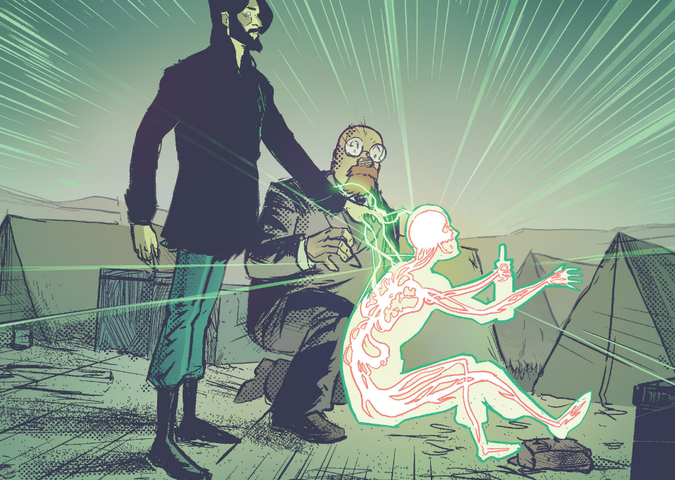 Визуальный язык поддерживает этот поворот. Россмо рисует Распутина не тяжелой монолитной фигурой, а худым, почти прозрачным, постоянно колеблющимся телом. Линия дрожит, силуэт часто размывается, черная густая масса волос и бороды обрамляет не грозную икону, а уставшее, местами растерянное лицо. Холодный зеленый, которым отмечены эпизоды целительства и мистических вмешательств, работает не как знак злой силы, а как напоминание о цене контакта с чем-то нечеловеческим: свет вытесняет привычные цвета, обжигает сцены, каждый раз показывая, что любое чудо оставляет след, новую рану, новый долг.