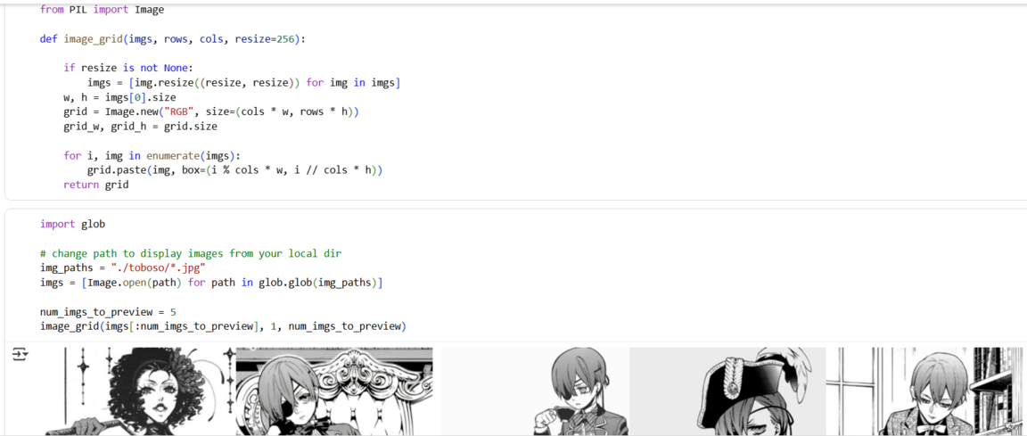 В рамках данного проекта я подготовил собственный датасет, собрав изображения из манги «Тёмный дворецкий» авторства Яны Тобосо. Мне стало интересно провести эксперимент: проверить, насколько обучаемая нейросеть сможет уловить характерные черты её стиля и воспроизвести их в новых изображениях.