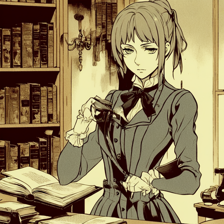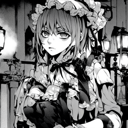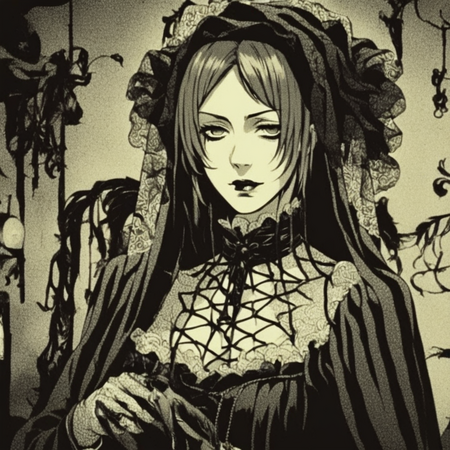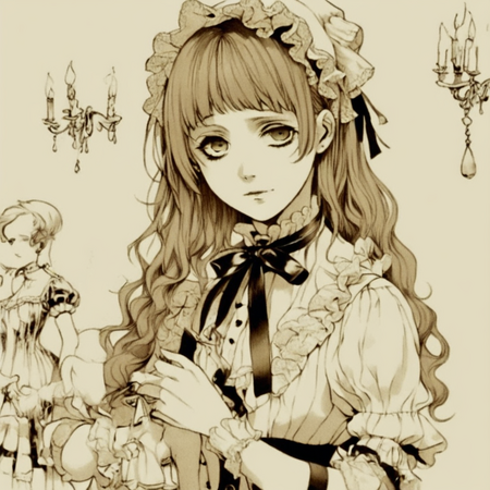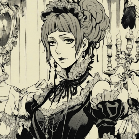 Кроме того, модель уверенно взяла на себя атмосферу: викторианская эстетика, орнаменты, драматический контраст и обилие деталей в одежде — это читается ясно. В то же время видны типичные артефакты генеративных моделей при попытке воспроизвести стилистику манги: непоследовательность штриховки, проблемные руки, пальцы и чрезмерная симметрия лиц.