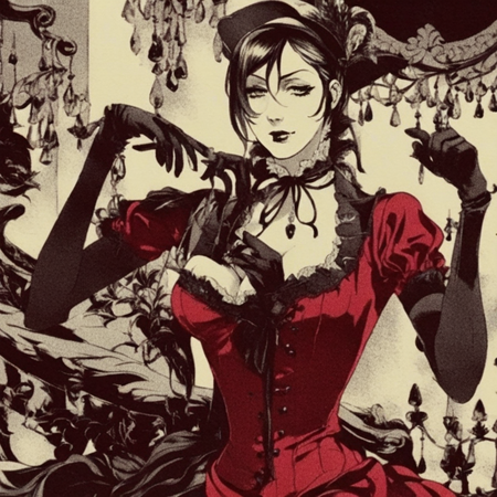 prompt: «photo collage in YANA TOBOSO style, Victorian femme fatale in a crimson silk dress»