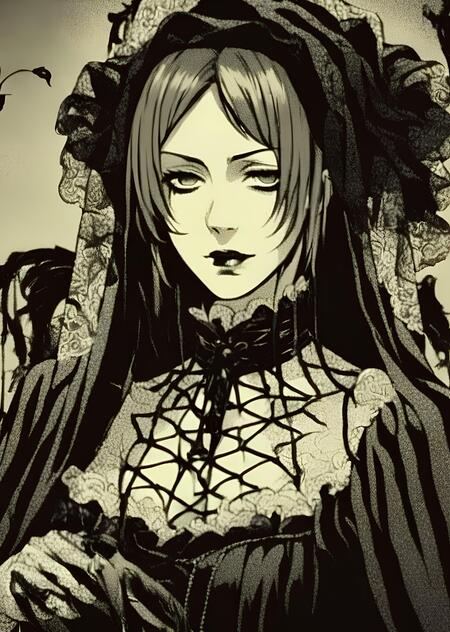 В общем и целом, готическая, декадентская подачи в изображениях модели читается чётко. Нейросеть хорошо подхватывает сложные элементы костюма, часто делает сильные тёмные пятна/акценты, что приближает к стилизации манги.
