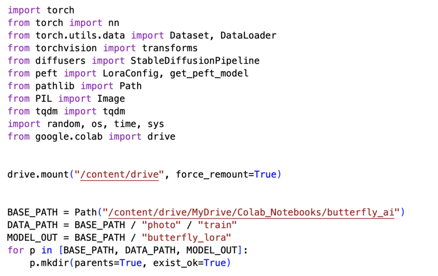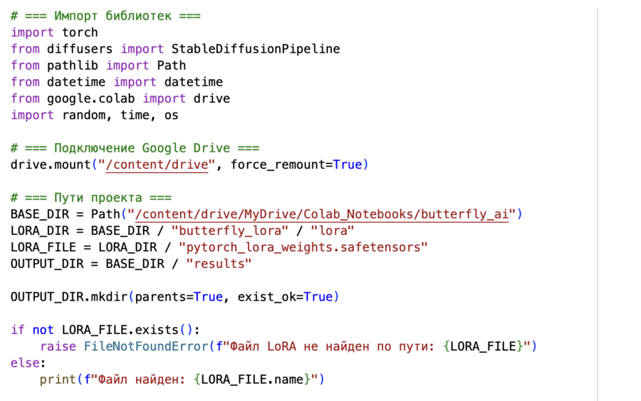 1. Инициализация среды: подключение необходимых библиотек, монтирование Google Drive к среде Google Colab, и настройка файловой структуры проекта путем указания путей к рабочим директориям.