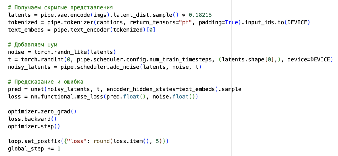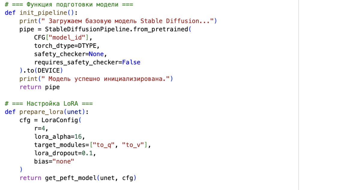 5. Подготовка модели: загрузка предварительно обученной модели Stable Diffusion и инициализация метода LoRA для кастомизации и адаптации модели к целевой задаче.