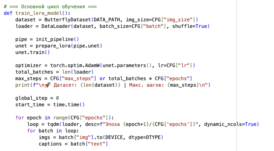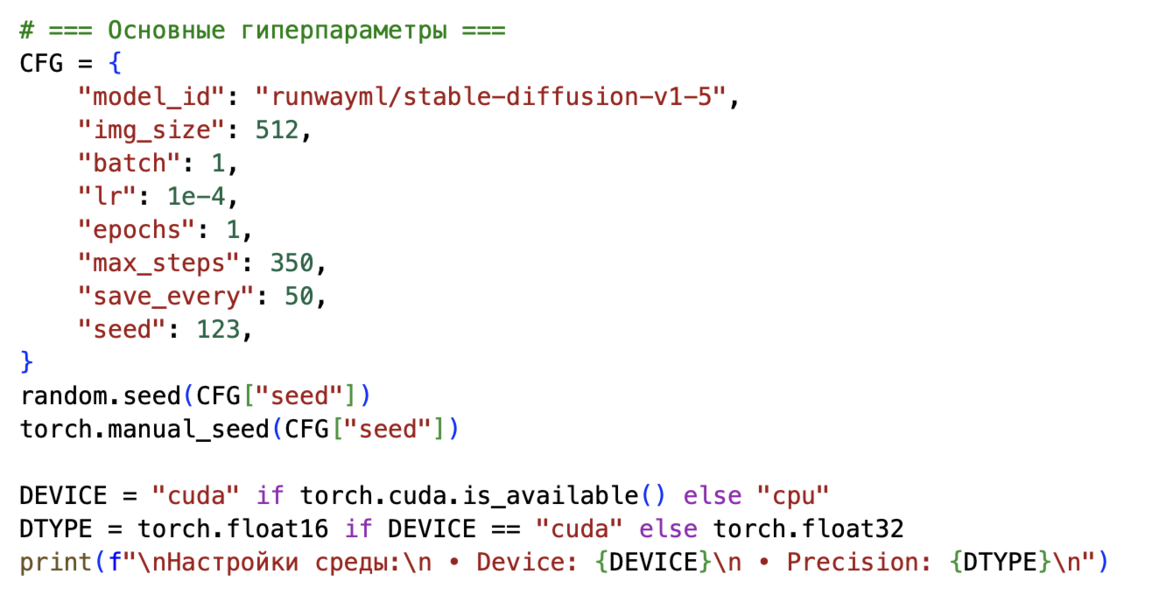 2. Конфигурация обучения: определение CFG — структуры, содержащей основные гиперпараметры, управляющие ключевыми аспектами процесса обучения нейросети.