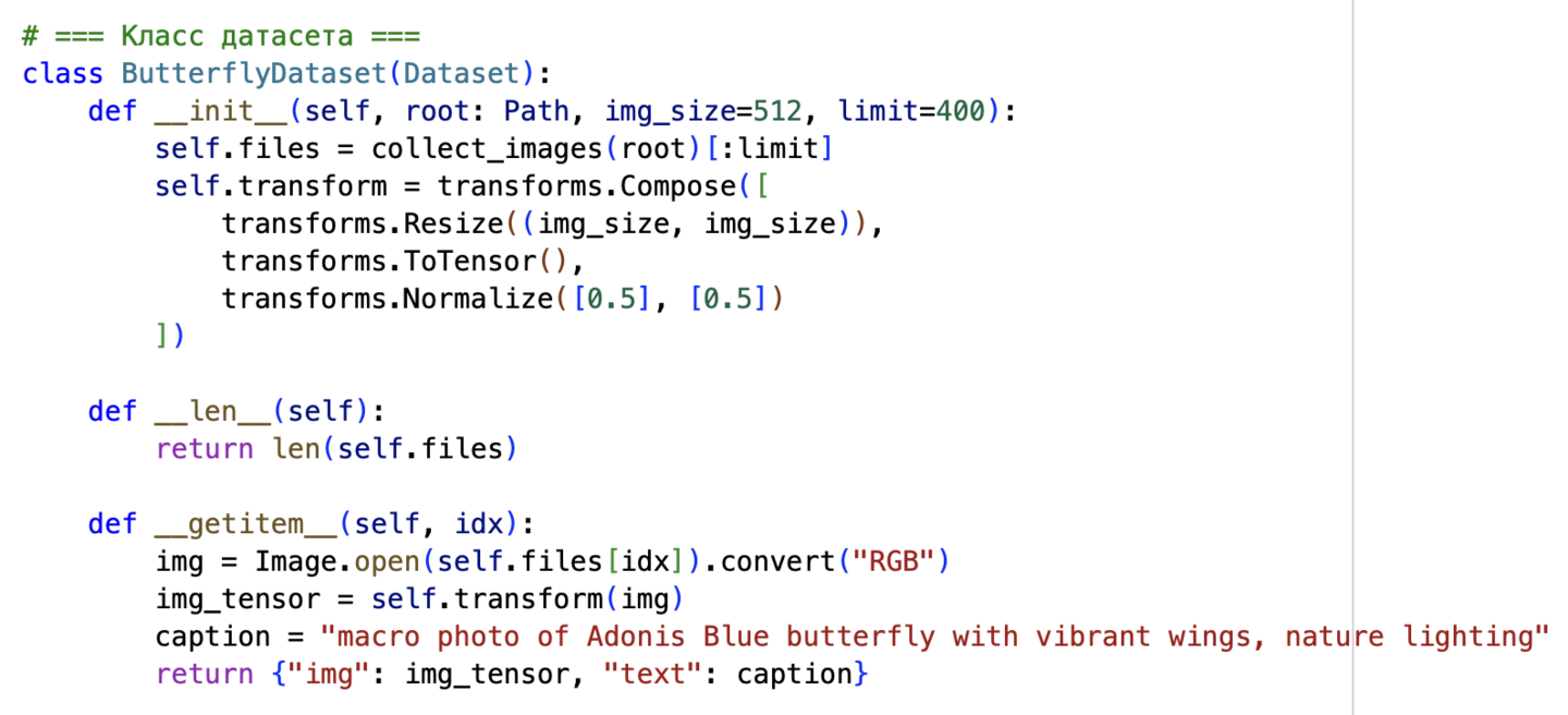 4. Определение структуры данных: создание класса датасета, определяющего логику загрузки, предобработки и форматирования отдельных изображений для последующего использования в процессе обучения.