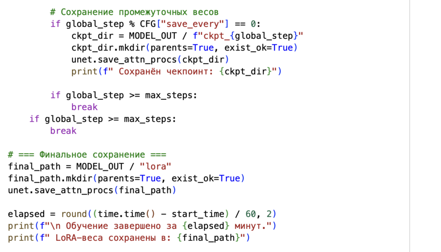 7. Сохранение: итоговые параметры LoRA модели сохраняются для дальнейшего использования.
