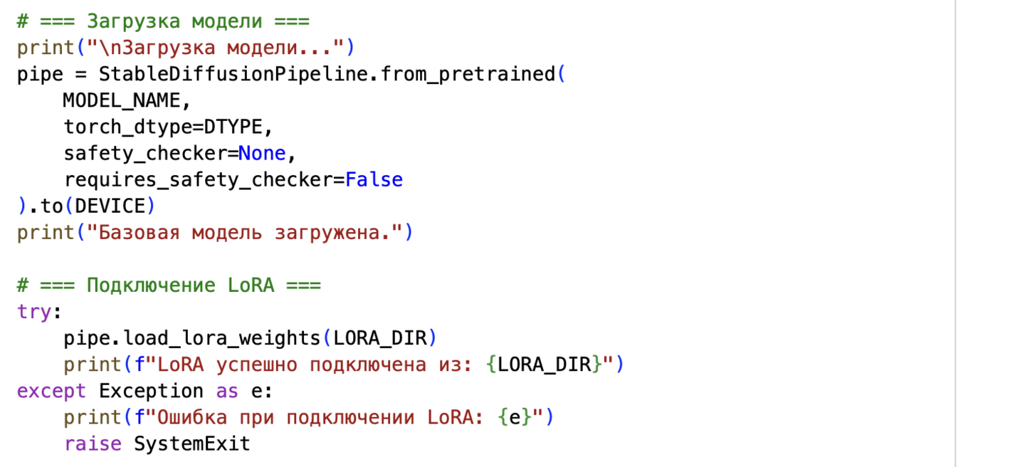 3. Подготовка генеративной модели: загрузка базовой модели Stable Diffusion и применение обученного LoRA адаптера для получения кастомизированной модели, готовой к генерации изображений.