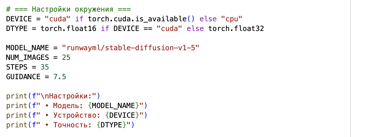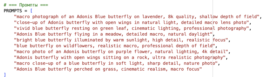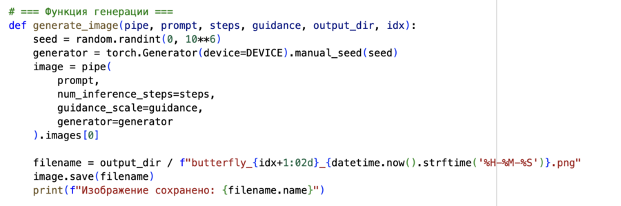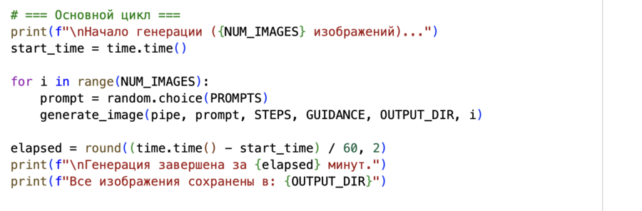 6. Автоматизация генерации: основной цикл, который последовательно запускает функцию генерации для каждого промпта из списка, обеспечивая создание серии изображений.