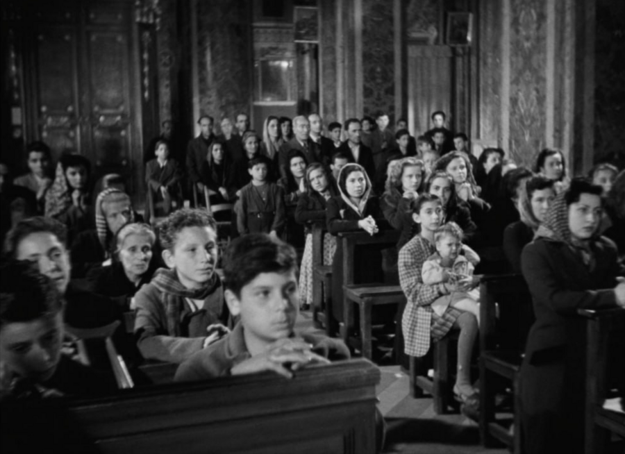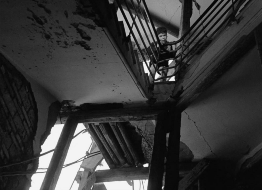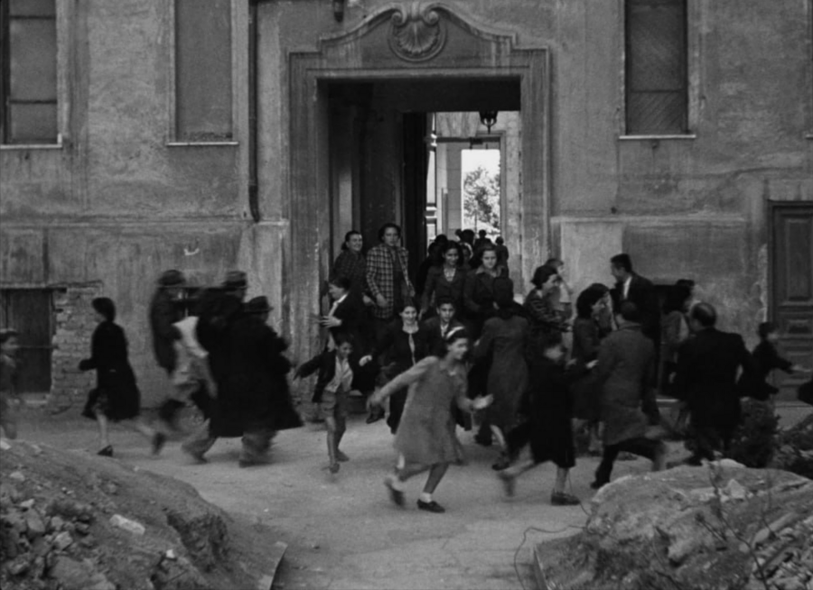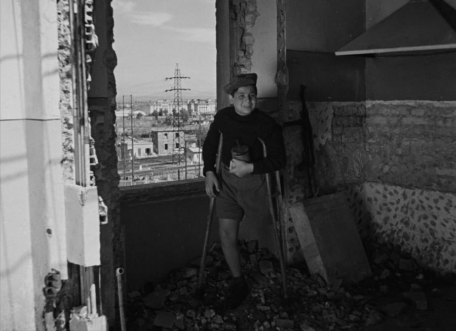 Росселлини снимает Рим как город без устойчивого центра: разрушенные дома, замёрзшие кварталы — всё это не фон, а живая ткань фильма.