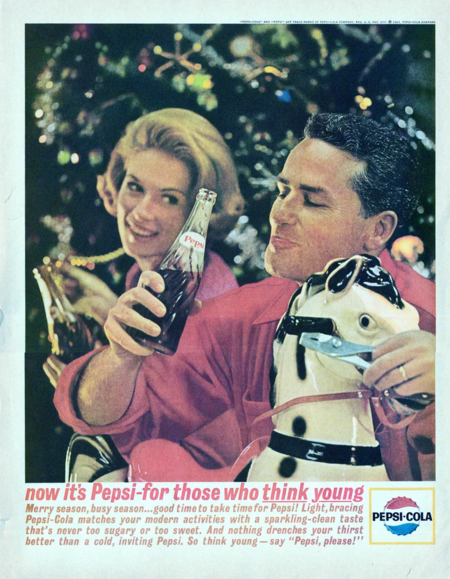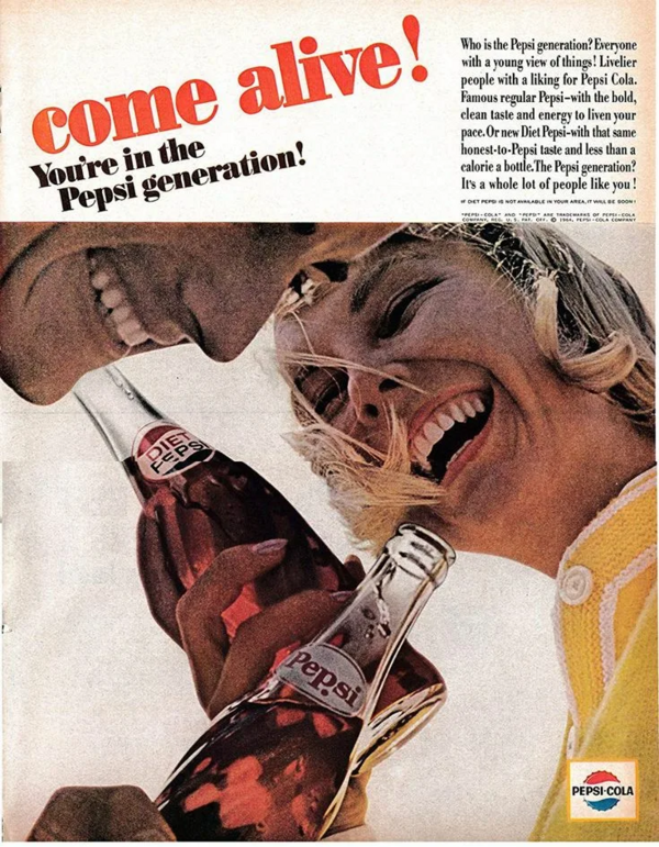 Pepsi — это не просто напиток, а символ «нового поколения», «жизни по-новому», «мы другие». Это первая массовая рекламная кампания, которая сегментировала аудиторию не по доходам, а по возрасту.