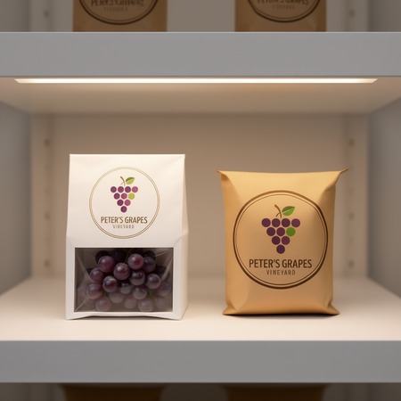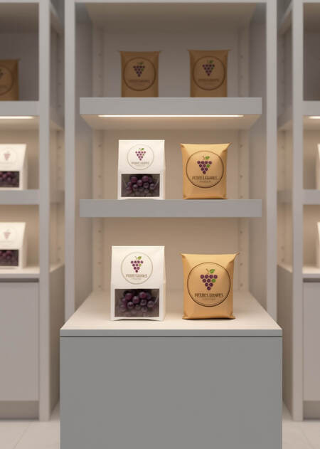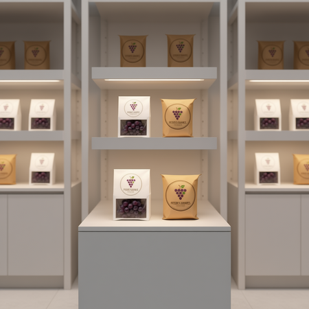 Сгенерировано: Qwen. Промпт: создай фотографию интерьера магазина где в ящиках лежит виноград, а на прилавках стоят упаковки как на фотографии.