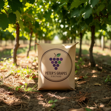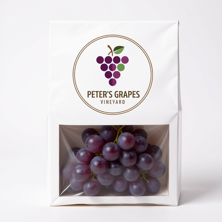 Сгенерировано: Qwen. Промпт: Создай фотографию упаковки винограда, с логотипом как на прикреплённом изображении. Промпт: Создай фотографию упаковки винограда, которая лежит под виноградником, с логотипом как на прикреплённом изображении.