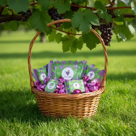 Сгенерировано: Qwen. Промпт: Создай упаковку для конфет в зелёных и лавандовых цветах в логотипом как на прикреплённых фотографиях. Создай фотографию плетёной корзины, которая стоит на траве под виноградником, а в ней лежат конфеты как на прикреплённой фотографии.