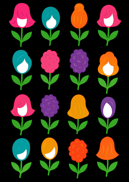 Prompt: A vibrant and playful brand identity pattern for a hair salon where colorful flower buds serve as a creative metaphor for unique and varied hairstyles. Each flower represents a distinct style, reflecting the personality and character through fresh, vibrant colors and a dynamic, cheerful composition, perfect for salon branding.