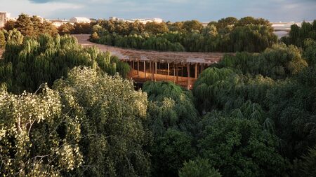 Форма и конструкция павильона вызывают ассоциации с природными структурами — плетёными гнёздами, корнями, древесной кроной.
