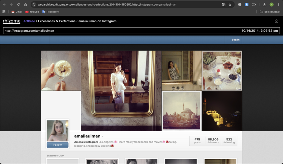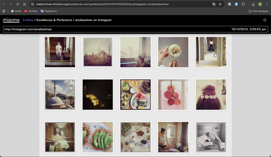 Excellences & Perfections (архив Instagram-перформанса) // Rhizome Web Archive URL: https://webarchives.rhizome.org/excellences-and-perfections/20141014171636/http://instagram.com/amaliaulman (дата обращения: 18.11.2025).