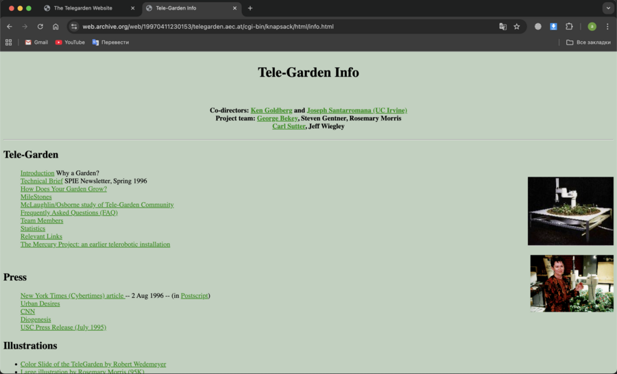 The Telegarden (архив 1997) // Wayback Machine URL: https://web.archive.org/web/19970411230153/telegarden.aec.at/cgi-bin/knapsack/html/info.html (дата обращения: 18.11.2025).