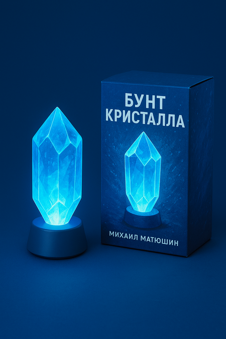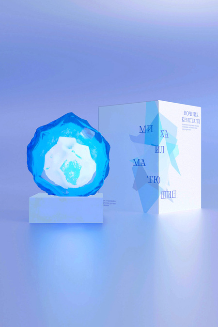 Promt: Generate an image of the product: a crystal-shaped night light and its packaging. In blue and light blue tones, write «revolt of the crystal» and the name of the artist «Mikhail Matyushin» on the packaging