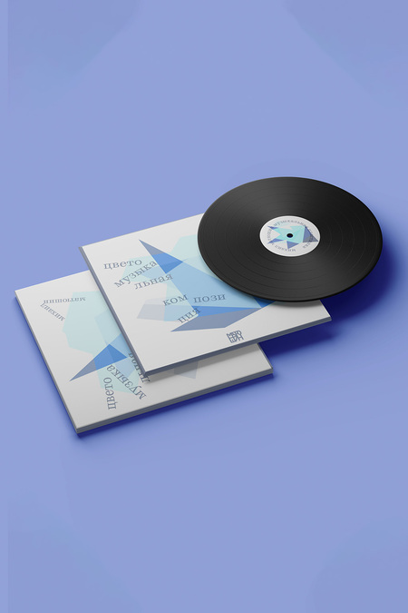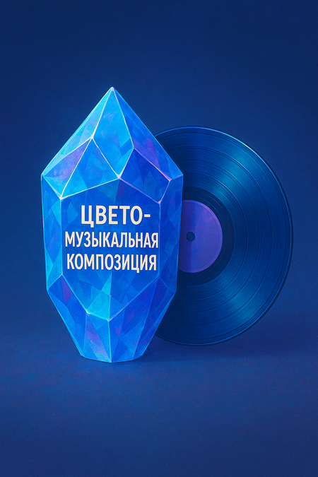 Promt: Generate an image of the product: a musical record in an unusual package in the form of a crystal, dedicated to the work of Mikhail Matyushin. Use blue, blue and purple colors. On the package, sign «Color and music composition»