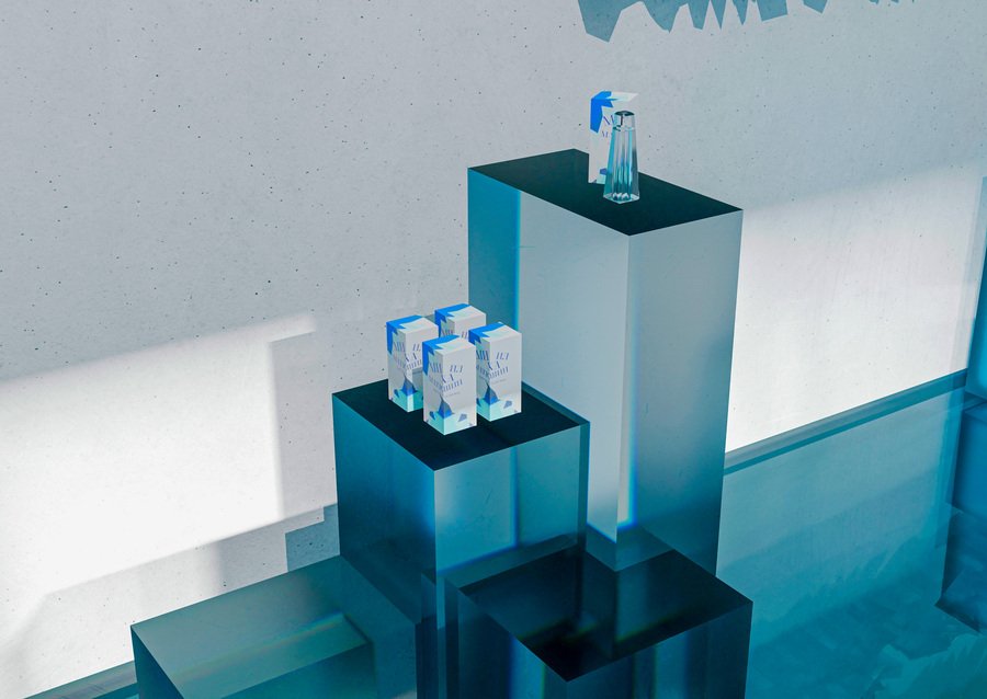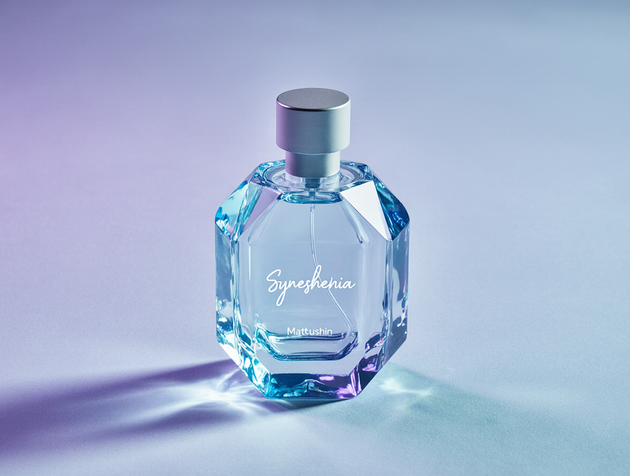 Promt 1: A high-resolution product photo of a perfume bottle named «Synesthesia». The bottle has a crystalline shape with soft, multifaceted edges, made of semi-transparent glass in shades of light blue, turquoise, and violet. The cap is matte silver and minimalist. Background: a smooth gradient from light blue to lilac, with a misty, ethereal glow. Lighting: top and side light emphasizing refraction, reflections, and subtle color dispersion through the glass. White minimalist typography on the bottle reads «СИНЕСТЕЗИЯ / Synesthesia by Matyushin». Style: elegant, futuristic, airy, inspired by synesthesia and avant-garde color theory.