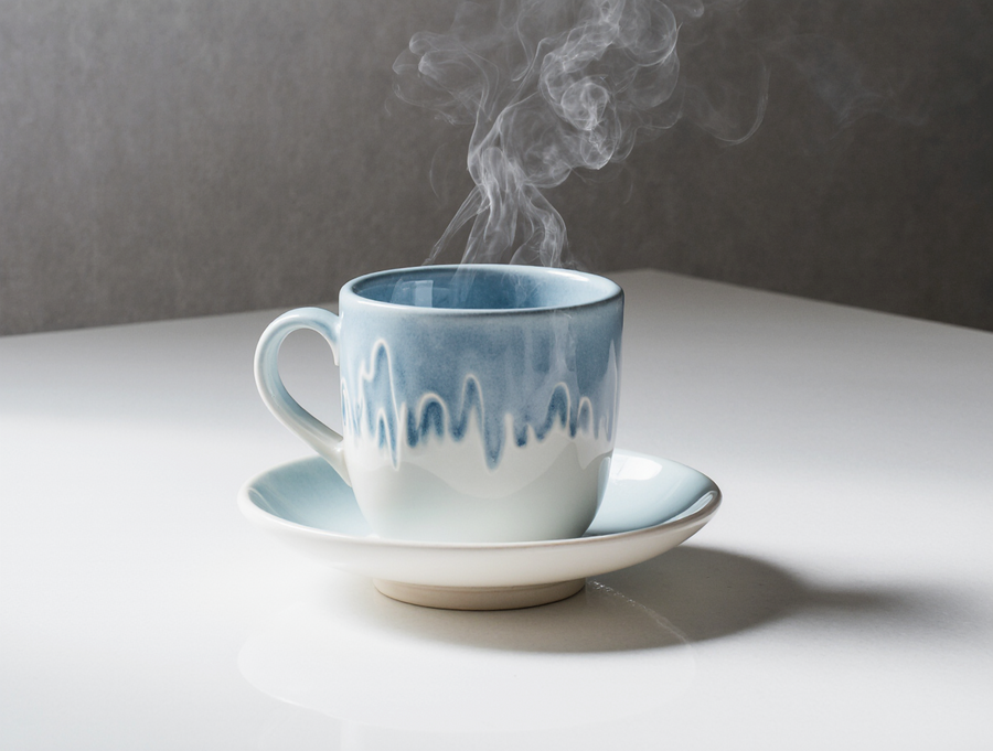Promt 3: A realistic product photo of a ceramic cup called «Transparent Sound / Прозрачное звучание». The cup has a smooth gradient from milky white at the base to sky blue at the top. A delicate sound wave pattern subtly appears on the side — as if revealed by heat. Light steam rises from the cup with a soft bluish tint, symbolizing sound. Background: a white tabletop with soft natural light and gentle shadows. Additional detail: a saucer with a faint crystalline pattern or reflection. Style: minimalist, poetic, evoking warmth and synesthetic harmony.