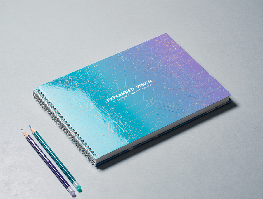 Promt 2: A realistic close-up of a designer sketchbook titled «Expanded Vision / Расширенное зрение». The cover is holographic with soft gradients of turquoise, cyan, and lavender that shift under the light. Geometric thin-line graphics inspired by optical perception diagrams are subtly embossed on the surface. The font is thin, modern, and geometric in white or silver. Background: a minimal studio setup with a light gray or concrete surface. Lighting: soft and angled to highlight the iridescent reflection. Additional elements: a transparent mechanical pencil or glass-tipped pen nearby. Style: clean, modern, slightly futuristic with a scientific-artistic feel.
