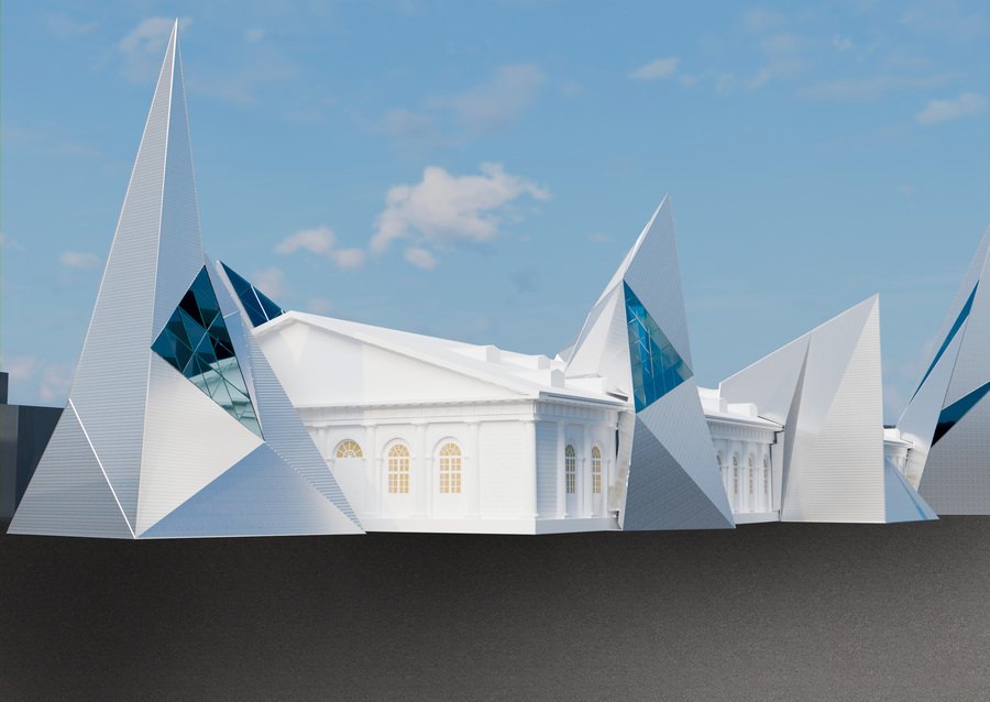«Бунт кристалла» это проект 1 курса, который состоит из возведения временного фасада манежа для выставки художника Михаила Матюшина. Пристройки в виде кристаллов вырываются из манежа, бунтуя и стремясь захватить все пространство вокруг. В одной из таких пристроек находится магазин с продукцией, вдохновленной творчеством художника.
