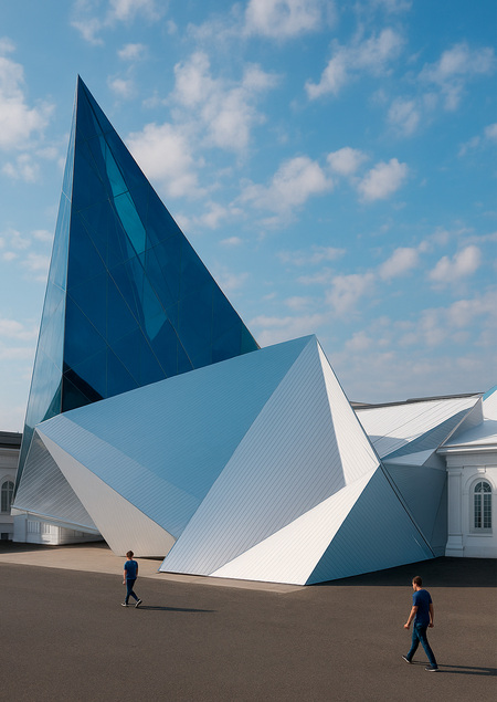 Promt: Create an image of a crystal-shaped building that houses a store featuring products related to an exhibition dedicated to Mikhail Matyushin. The architecture should be modern and reflective, with sharp angles and facets resembling a large gemstone. Inside the store, display various artistic items inspired by Matyushin’s work, such as paintings, sculptures, and prints. The atmosphere should be vibrant and inviting, with colorful lighting that highlights the exhibits and the unique structure of the building.