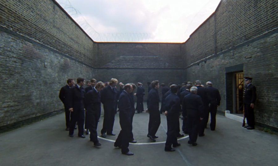 Тюремная администрация у Кубрика изображена как собрание карикатурных персонажей, чья напыщенная серьезность и абсурдная бюрократическая риторика мгновенно превращают мрачную тюремную систему в комедию абсурда. Надзиратели с их утрированно-суровыми лицами и начальник тюрьмы, вещающий с театральным пафосом, выглядят не столько стражами порядка, сколько участниками балаганного представления, что создает язвительную сатиру на систему наказания.