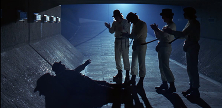 Если Бёрджесс исследует внутренний мир персонажей, то Кубрик интересуется ими как марионетками в спектакле социальных сил. Комическое несоответствие образов становится инструментом критики общества, где всё — от преступления до наказания — превратилось в разновидность шоу.