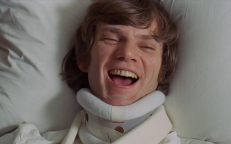 В фильме Кубрик намеренно утрирует образ писателя Франка Александера, превращая его из глубокого интеллектуала книги в истеричного и карикатурного параноика, чья театральная жестикуляция и преувеличенная эмоциональность вызывают скорее усмешку, чем сочувствие. Если у Бёрджесса это трагическая фигура с философской глубиной, то у Кубрика писатель становится гротескным элементом сатиры — его пафосные монологи и комично-драматичная реакция на Алекса полностью растворяют психологическую достоверность в фарсовой эстетике.